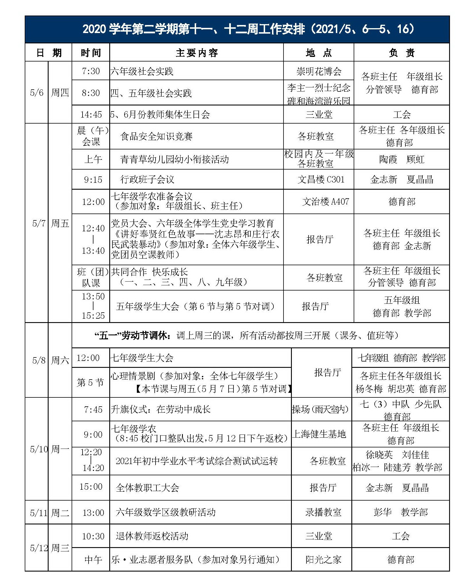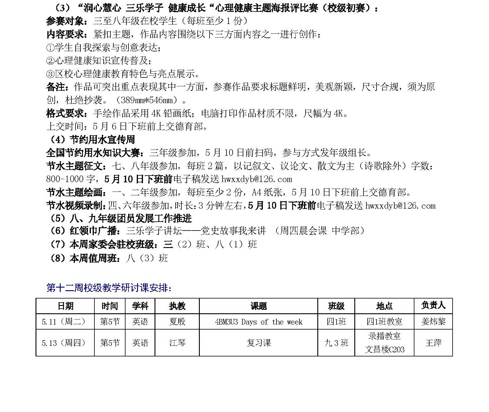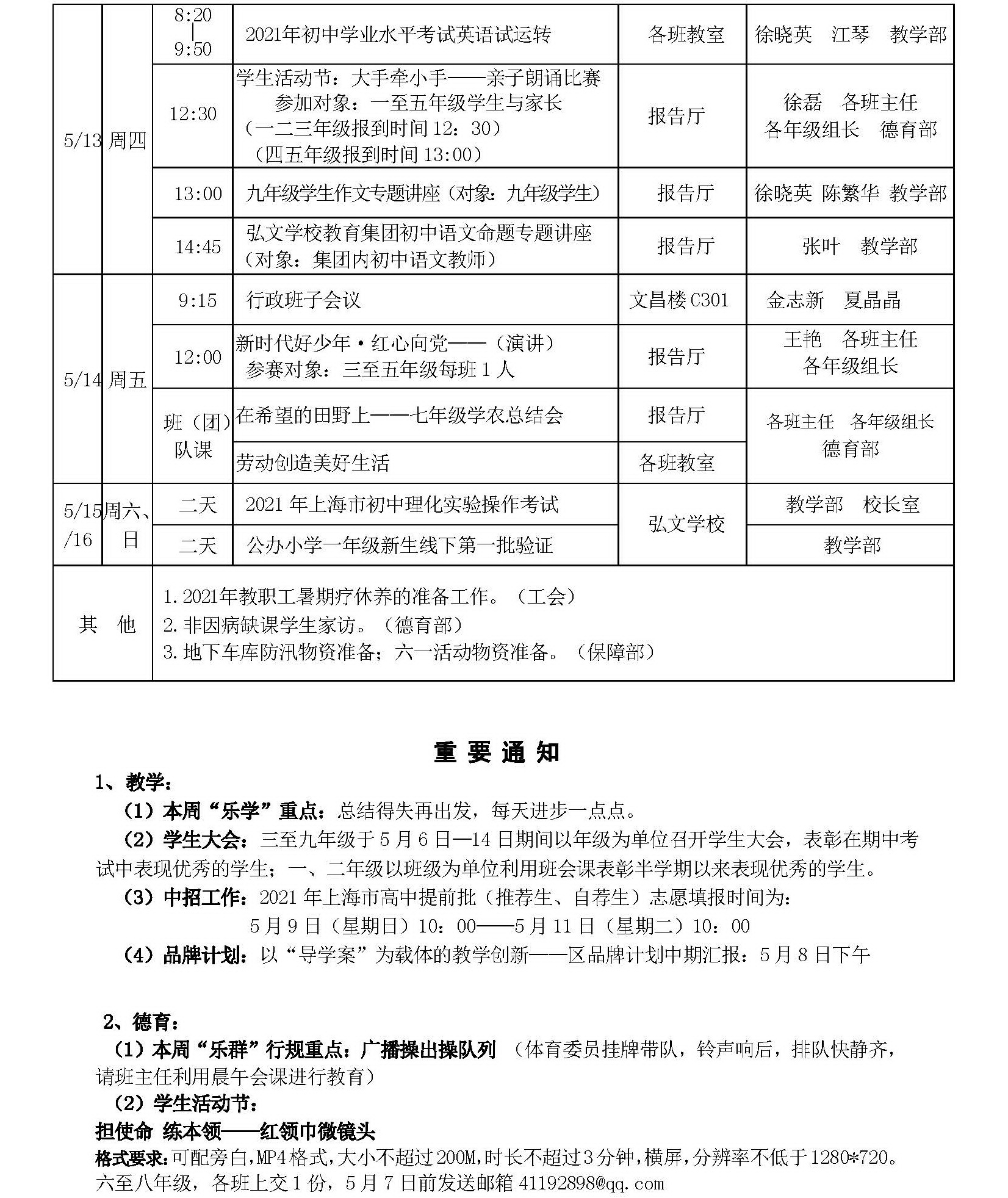 弘文学校2023学年第二学期第十一、十二周工作安排